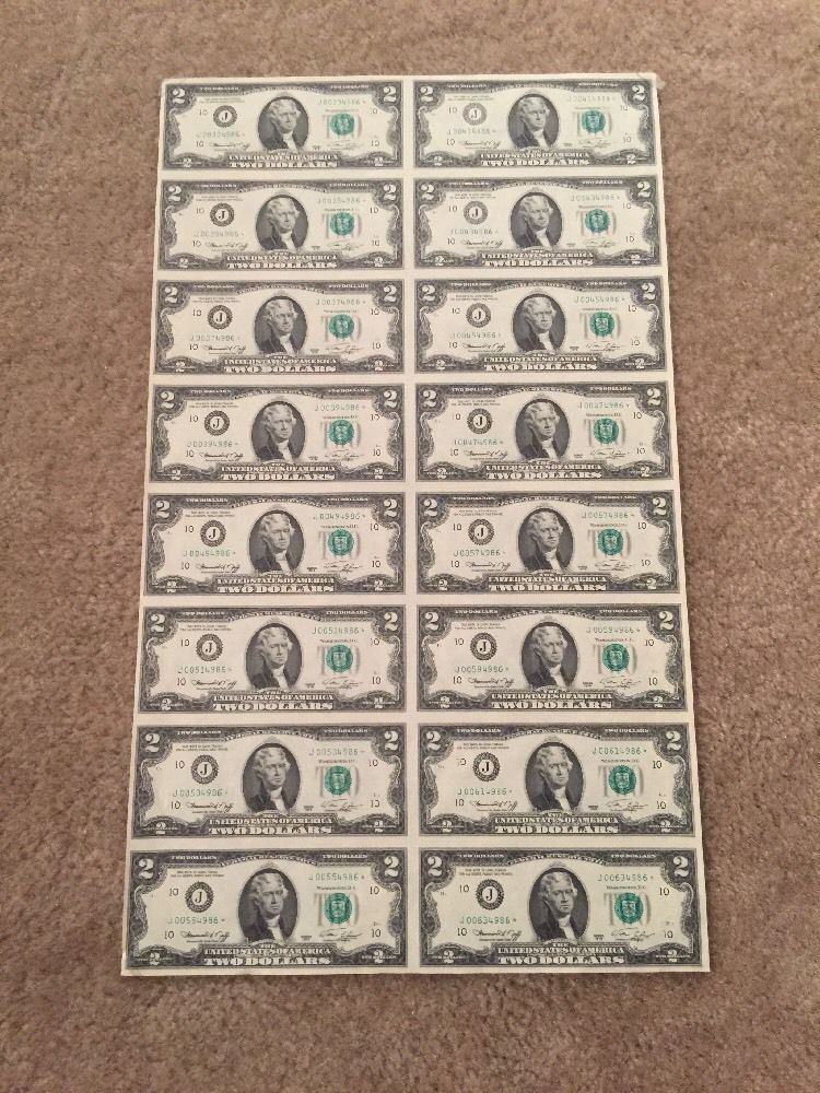 1976 Uncut Sheet Of 16 Crisp Us 2 Dollars Uncirculated Legal 2